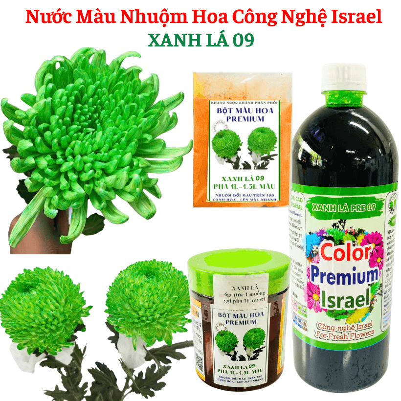 Bột Nhuộm Hoa Tươi Màu Xanh LÁ 09 (1 Hủ 70gr pha 10L – 14L Nước thuốc nhuộm hoa CHUẨN). Màu nhuộm xanh lá đậm hơn xanh cốm 1 tí. Màu nhuộm hoa tươi sáng, đẹp tự nhiên, mát dịu nhẹ xanh, gợi nhớ màu lá “Già” tạo sự thư giản, xanh mướt và yêu thiên nhiên. Một sức sống tràn đầy và năng lượng tích cực. Đặc biệt, hoa nhuộm màu xanh Lá không bị cháy lá khi nhuộm hoa.