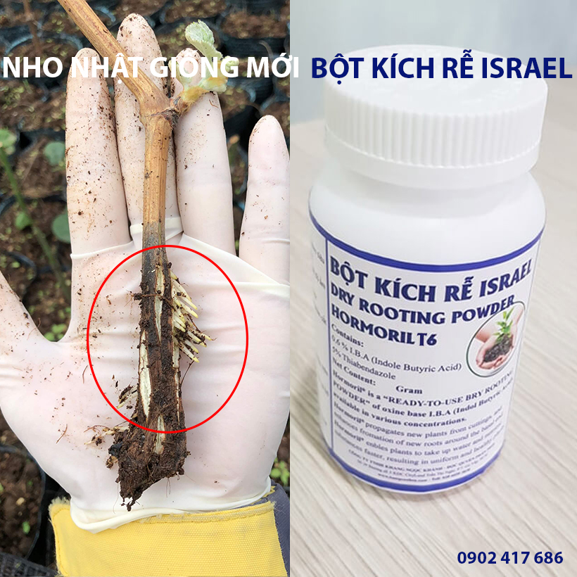 + Ngoài ra, với thành phần 0.6% IBA và chất ngừa nấm bệnh của thuốc kích rễ Israel Hormoril T-6 cô hoàn toàn yên tâm và quyết định thử nghiệm trên giống nho nhật bằng một phương pháp mới