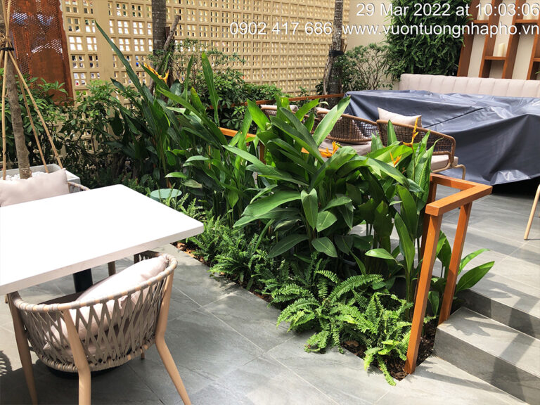 Vài hàng Chuối Phượng Hoàng và cây dương xỉ trồng phủ chân được thực hiện nhanh chóng vẫn theo đúng thiết kế