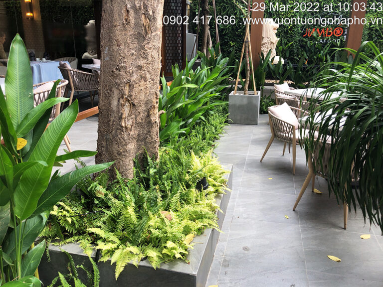 Nâng bồn phía trước và trồng cỏ lá gừng cũng là ý tưởng hay. Tuy nhiên, điều không may mắn là Khang Ngọc Khánh KHÔNG ĐƯỢC tham gia thi công hệ thống tưới nhỏ giọt tự động cho Nhà Hàng Jumbo nên cũng là một thiệt thòi. Người lắp tưới cho cây lại không hiểu về cây trồng như cây cỏ thì cần lưu lượng nước tưới 1 ngày bao nhiêu ml là đủ? Cây dương xỉ, cây đuoi công, cây tổ phụng … vì vậy cũng vài khu vực cây bị khô nước trầm trọng và vài khu vực cây bị dư nước làm thối cả gốc và rễ cây