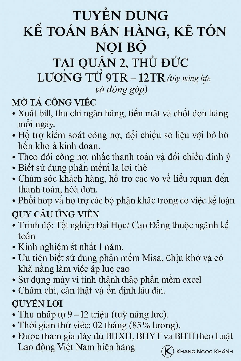 Hồ sơ tuyển dụng kế toán bán hàng tại Khang Ngọc Khánh gởi qua ZALO: 0902 877 396 hay hai.phan.nuflower@gmail.com