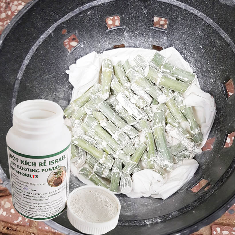 + Cách 2: Hòa 2g Bột Hormoril T-6 với 1 Lít nước ấm, nhúng phần gốc (từ 1-3cm) và để 3-5 phút sau đó cho vào “Hom”giữ ẩm