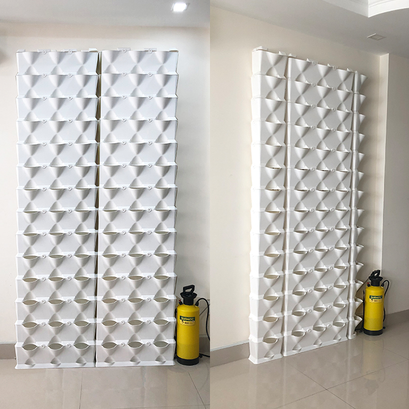 + Gồm 8 module đứng Vertical: Xếp chồng lên nhau mỗi hàng tạo Kích thước phủ xanh vườn đứng ngang 0.7M x Cao 1.6M (8 tầng x 24 hốc cây xanh)+ Kèm 1 Tray hứng nước thừa
