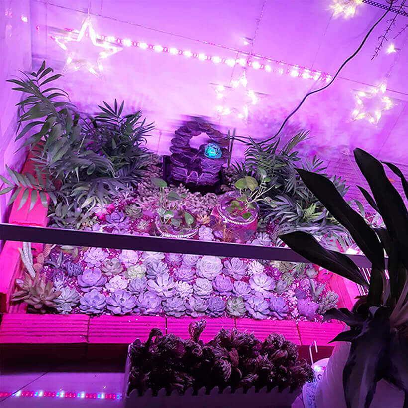 Cây sen đá có đặc tính “không cần nhiều nắng trực tiếp” nhưng vẫn phải đủ sáng để cây quang hợp tốt. Ở những khu vực thiếu nắng như giếng trời, ban công hay chỗ trồng cây bị che khuất bởi tòa nhà thì việc sử dụng đèn LED quang hợp cây trong nhà là rất tốt